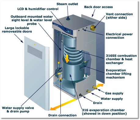 We recommend installing a natural gas fired humidifier. These humidifiers introduce steam into the air stream, in the same manner as a electric units, except that heat is supplied by less expensive natural gas. Installation will involve supplying natural gas to the new appliance and making proper arrangements for introduction of combustion air and venting of flue gases.